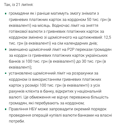 • Лимит на снятие налички с гривневых карт за границей сменен с месячного на недельный. (Ранее - 50 тыс./мес, теперь - 12,5 тыс./нед);