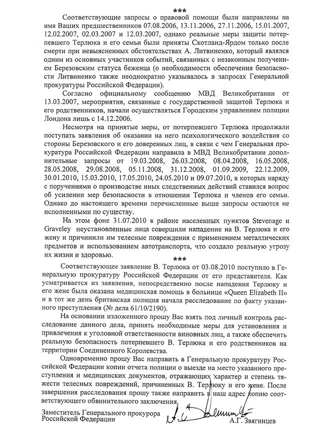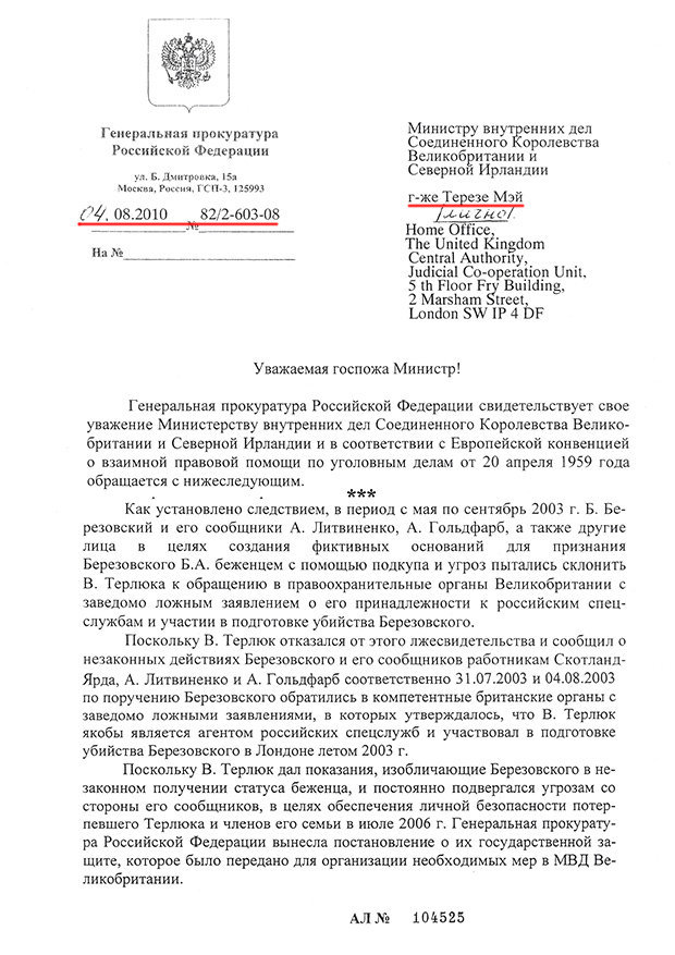 Так, в 2010 году заместитель генпрокурора отправил на имя Мэй личное письмо по поводу "ненадлежащего обеспечения британскими властями безопасности участников уголовного процесса по делу Бориса Березовского". Оно, как и другие обращения Генпрокуратуры, осталось без ответа.