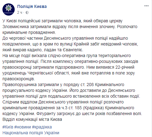 "В дежурную часть Деснянского управления полиции поступило сообщение, что в храм по улице Крайней вбежал неизвестный мужчина, который похитил кадило, ладан и Евангелие", - сообщили полицейские.