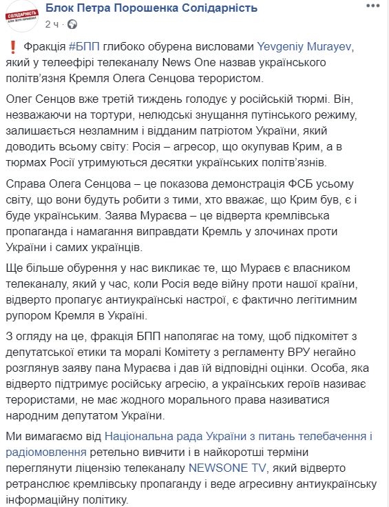 "Если Верховная Рада хотя бы на грамм себя уважает, то скотина Мураев будет лишен депутатского мандата. В мирной цивилизованной стране этот подонок попал бы в тюрьму как пособник террористов, а если бы была объявлена настоящая война, то Мураева бы пристрелили как предателя на месте. Интересно, как отреагирует парламент на это демонстративное и спланированное оскорбление умирающего за свои принципы человека и гражданина Украины агентом российских спецслужб Мураевым, который работает под прикрытием депутата и владельца телеканала NewsОne?".