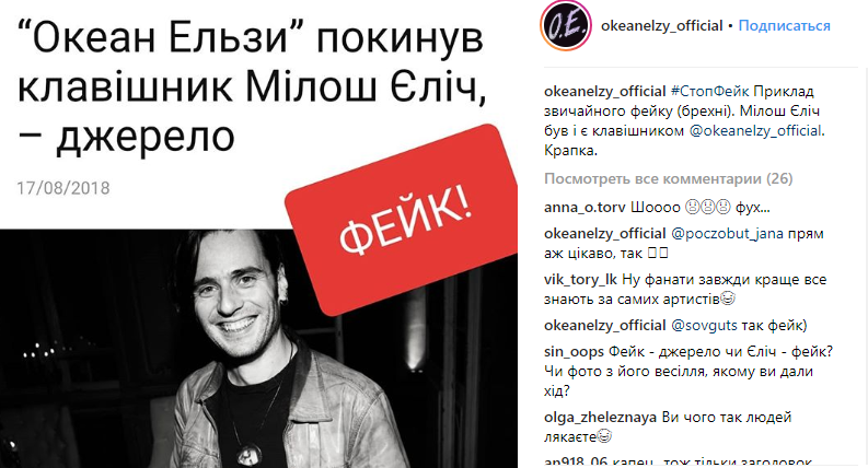 "Пример обычного фейка (лжи). Милош Елич был и есть клавишником "Океан Эльзы". Точка",