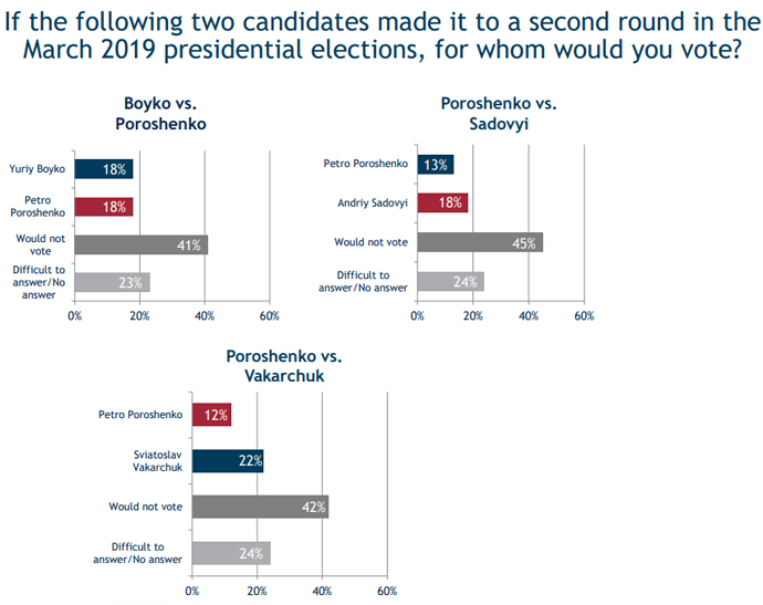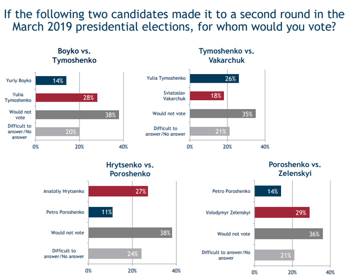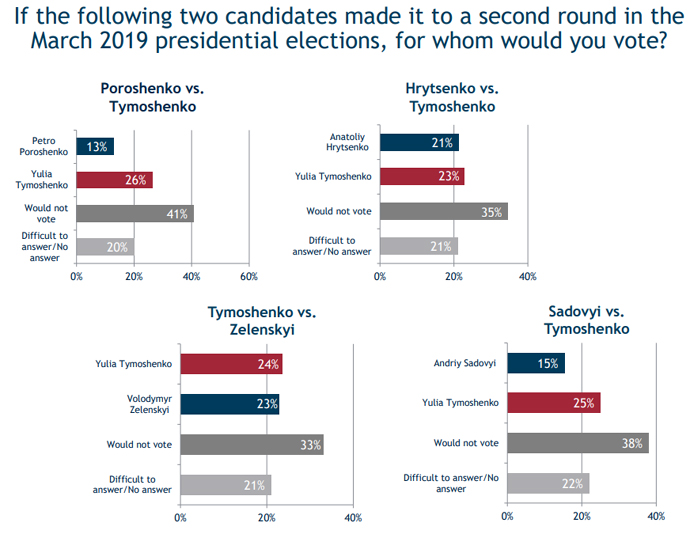 Об этом свидетельствуют результаты опроса, проведенного в декабре 2018 года "Социологической группой "Рейтинг" по заказу Международного республиканского института. Социологи предлагали респондентам пары политиков во втором туре и просили поддержать одного из них. В парах Тимошенко – Порошенко, Тимошенко – Садовой, Тимошенко – Бойко и Тимошенко – Вакарчук – победила бы Тимошенко. Только в паре Тимошенко – Зеленский и Тимошенко – Гриценко оба кандидата имели бы примерно одинаковые шансы на победу.