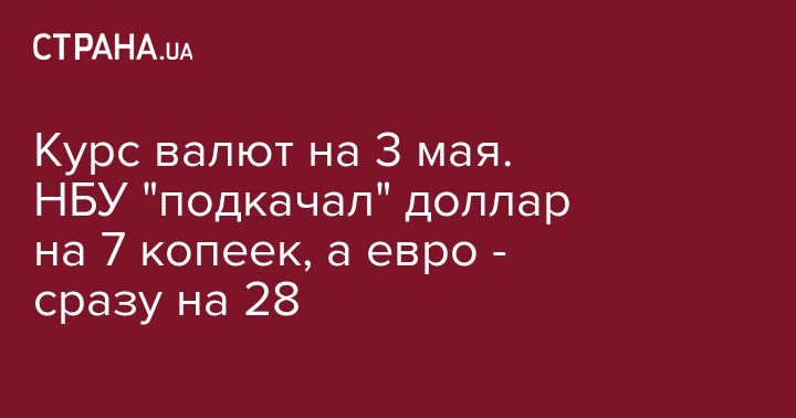 Кроме того, регулятор повысил курс евро на 28 копеек до 29,77 гривен за евро. Официальный курс европейской валюты на 3 мая установлен на уровне 2977,598 гривни за 100 евро (+28,1616 грн).