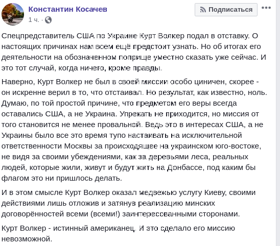 Глава международного комитета Совета Федерации в РФ Константин Косачев заявил, что ушедший в отставку спецпредставитель США по Украине Курт Волкер своими решением лишь отсрочил реализацию минских договоренностей. Об этом он написал на своей странице в Facebook.