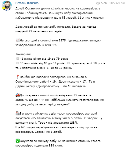 "Больше всего случаев заболевания обнаружили в Соломенском районе – 19, Деснянском – 17 и в Дарницком и Днепровском – по 10 случаев. В больницы столицы госпитализировали 25 пациентов. Отмечу, что это – чуть ли не самое большое количество госпитализированных за сутки за весь период пандемии", - написал градоначальник.