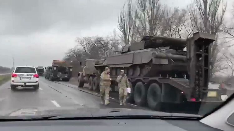 Еще один ролик, который публикуют пользователи соцсетей, был, как утверждается, снят под Мариуполем. В колонне украинской военной техники видны танки.