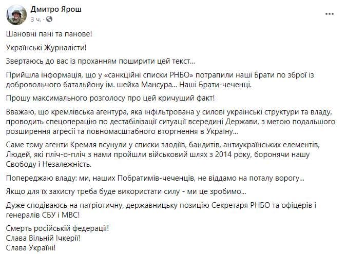 Пост о чеченцах написал и бывший глава "Правого сектора" Дмитрий Ярош. Он заявил, что националисты не допустят выдачи этих людей в Россию, пригрозив применить силу.