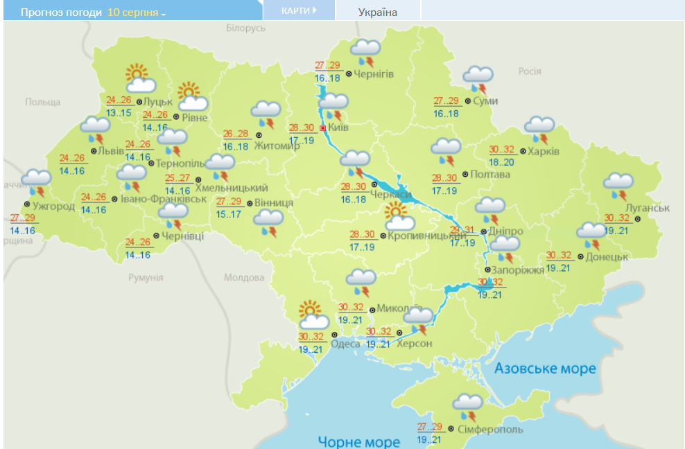 Во второй рабочий день недели, 10 августа, по всем областям Украины прокатятся грозы. Они обойдут стороной лишь Кропивницкий, Одессу, Луцк и Ровно.