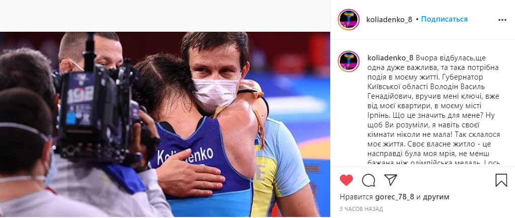 "Что это значит для меня? Ну чтобы вы понимали, я даже своей комнаты никогда не имела! Так сложилась моя жизнь. Свое собственное жилье - это действительно была моя мечта, не менее желанное, чем олимпийская медаль. И вот сегодня я держу, право собственности на однокомнатную квартиру в 41 м. кв. И уже завтра я могла начать ремонтные работы. Но .... но за всеми моими победами стоит еще один человек. Это мой тренер, с которым я работаю на протяжении восьми лет, который меня не только тренирует, но и всегда был рядом на протяжении всего времени", - написала Коляденко.