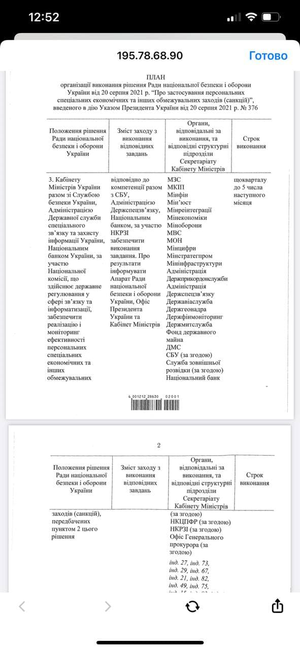 План организации выполнения санкций следующий - Кабмин, Госслужба спецсвязи, Нацбанк Украины, Национальная комиссия, осуществляющая регулирование в сфере связи и защиты информации, НБУ должны обеспечить реализацию и мониторинг эффективности персональных санкций. Срок выполнения - до 5 числа следующего месяца ежеквартально.