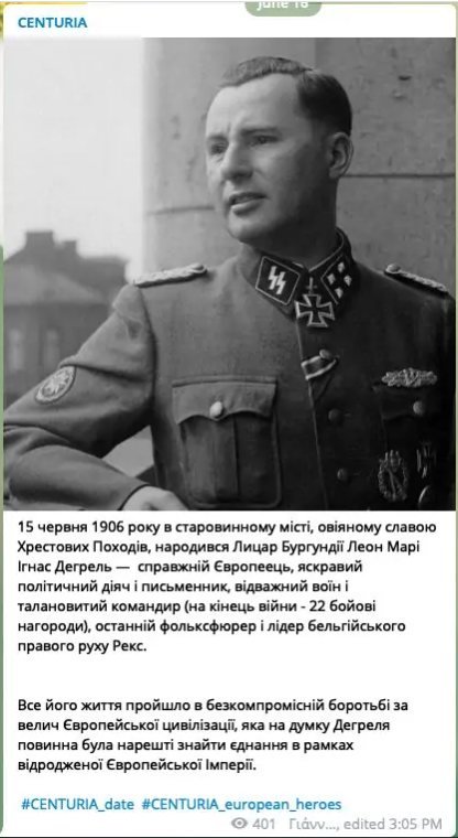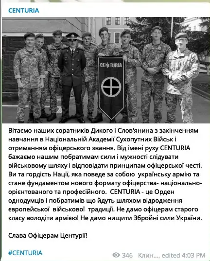 "По крайней мере, с 2019 года Centuria объявила о нескольких мобилизациях, призывая идеологически настроенных членов ВСУ добиваться перевода в определенные подразделения, где служат члены группы. Чтобы привлечь новых членов, группа - через свой канал Telegram, у которого более 1200 подписчиков и специальный бот для мобилизации - продолжает рекламировать свою предполагаемую роль в ВСУ и доступ к западным программам обучения, вооруженным силам и обмену", - говорится в резюме доклада.