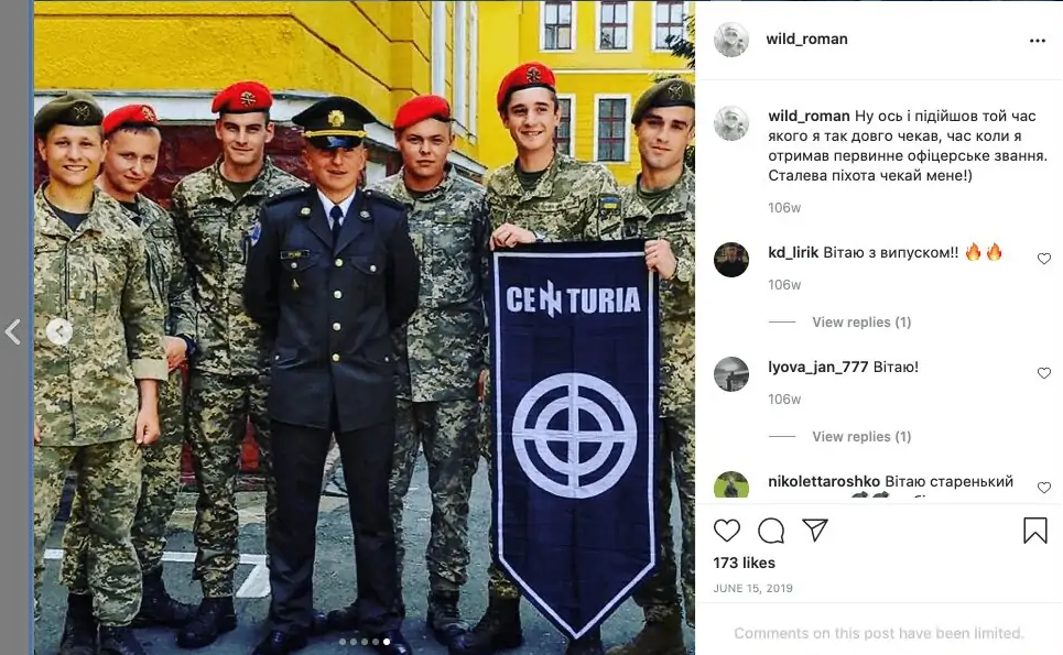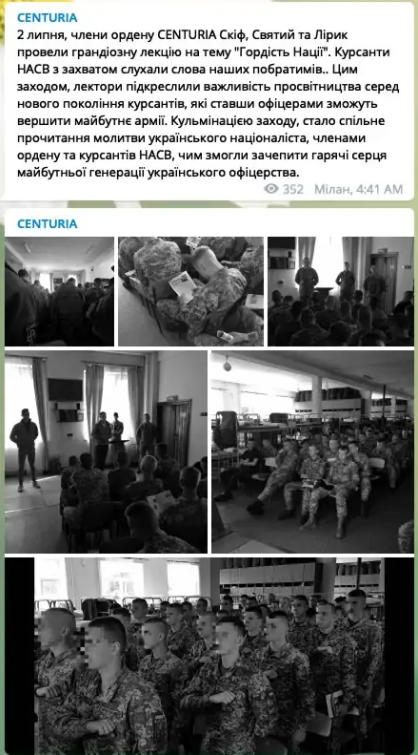 Также в докладе присутствует множество фото, на которых в числе членов ультраправой организации Centuria запечатлены курсанты Национальной академии сухопутных войск им. Сагайдачного.