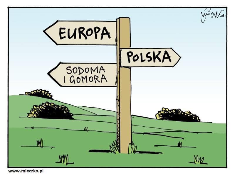 Часть поляков считает, что им не по пути с ЕС, где, по их мнению, процветает "Содом и Гоморра". Карикатура Анджей Млечко
