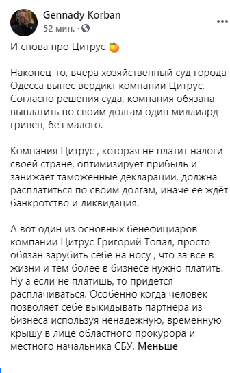 "Компания "Цитрус", которая не платит налоги своей стране, оптимизирует прибыль и занижает таможенные декларации, должна расплатиться по своим долгам, иначе ее ждет банкротство и ликвидация. А вот один из основных бенефициаров компании "Цитрус" Григорий Топал, просто обязан зарубить себе на носу , что за все в жизни и тем более в бизнесе нужно платить. Ну а если не платишь, то придется расплачиваться. Особенно когда человек позволяет себе выкидывать партнера из бизнеса используя ненадежную, временную крышу в лице областного прокурора и местного начальника СБУ", - говорится в сообщении.
