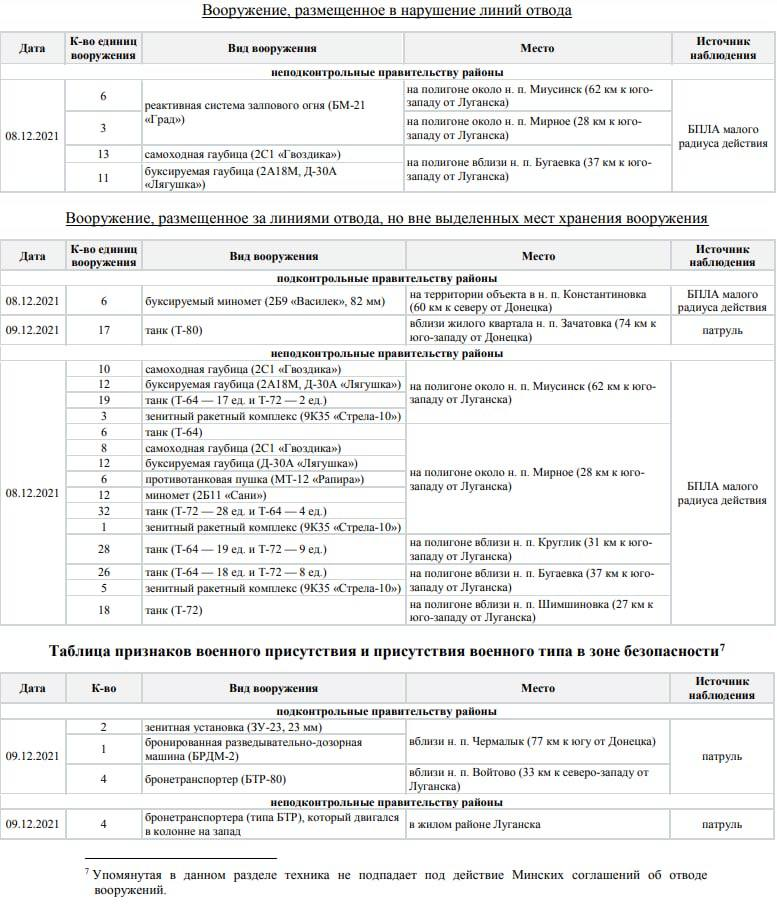"Миссия зафиксировала 9 реактивных систем залпового огня и 24 буксируемые гаубицы, размещенные в нарушение линий отвода на полигонах в неподконтрольных правительству районах Луганской области. За линиями отвода, но вне выделенных мест хранения вооружения СММ обнаружила 6 минометов на территории объекта и 17 танков на железнодорожной станции в подконтрольных правительству районах Донецкой области, а также 129 танков, 42 гаубицы, 12 минометов, 9 зенитных ракетных комплексов и 6 противотанковых пушек на 5 полигонах в неподконтрольных правительству районах Луганской области", - говорится в отчёте.