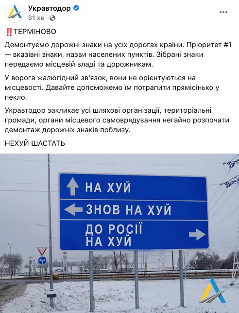 "Демонтируем дорожные знаки на всех дорогах страны. Приоритет #1 – указательные знаки, названия населенных пунктов. Собранные знаки передавайте местной власти или дорожникам", - говорится в сообщении.