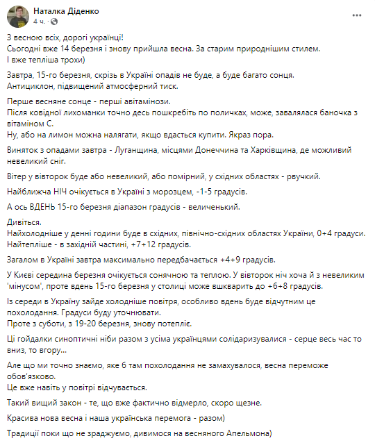 Красивая новая весна и наша украинская победа – вместе", - заключила Наталья Диденко.