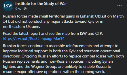 "Российские силы продолжают собирать подкрепление и пытаются улучшить материально-техническое обеспечение как на киевском, так и на южном направлениях. Продолжающиеся усилия России по возмещению боевых потерь как российскими пополнениями, так и нероссийскими источниками, включая сирийских бойцов и группу "Вагнера", вряд ли позволят России возобновить крупные наступательные операции в течение ближайшей недели", - сообщили в институте.