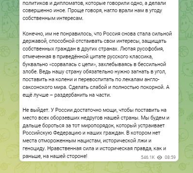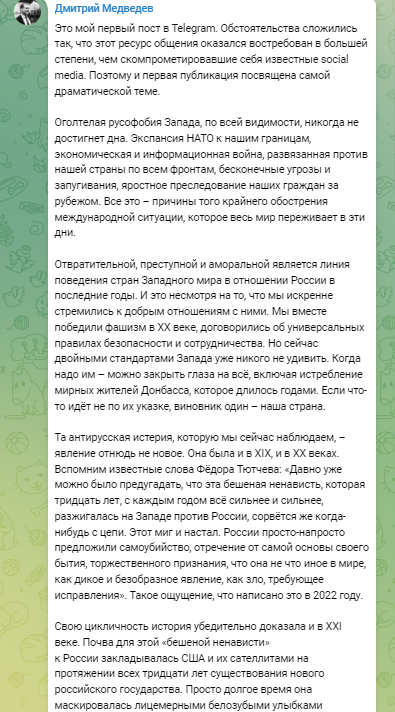 Экс-президент России и заместитель главы Совбеза РФ Дмитрий Медведев завел телеграм-канал и опубликовал там первое сообщение. В нем он рассуждает о "русофобии Запада" и пишет, что у России "достаточно мощи, чтобы поставить на место" недругов.