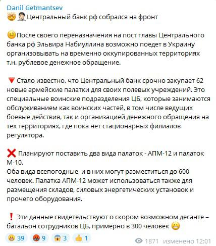 "Стало известно, что Центральный банк срочно закупает 62 новые армейские палатки для своих полевых учреждений. Это специальные воинские подразделения ЦБ, которые занимаются обслуживанием как воинских частей, в том числе ведущих боевые действия, так и организацией денежного обращения на тех территориях, где пока нет стационарных филиалов регулятора", - объяснил Гетманцев.