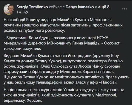 "Издателя Михаила Кумко и членов его семьи (супругу Веру и дочь Татьяну) выпускающего редактора Евгению Борян, журналистов Юлию Ольховскую и Любовь Чайку сегодня задерживали вооруженные люди в Мелитополе. Сейчас все на свободе", - пишет Томиленко.