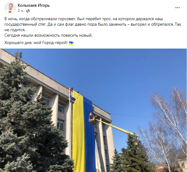 "В ночь, когда обстреливали горсовет, был перебит трос, на котором держался наш государственный стяг. Да и сам флаг давно пора было заменить - ​​выгорел и обтрепался. Так не годится. Сегодня нашли возможность повесить новый. Хорошего дня, мой Город-герой!" , - написал в соцсети градоначальник.