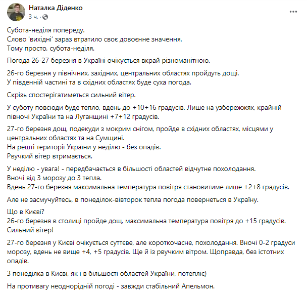 В субботу и воскресенье, 26 и 27 марта, в Украине ожидается весеннее тепло, но будет ветрено, а в некоторых регионах пройдут дожди и даже мокрый снег. Об этом сообщила синоптик Наталья Диденко.