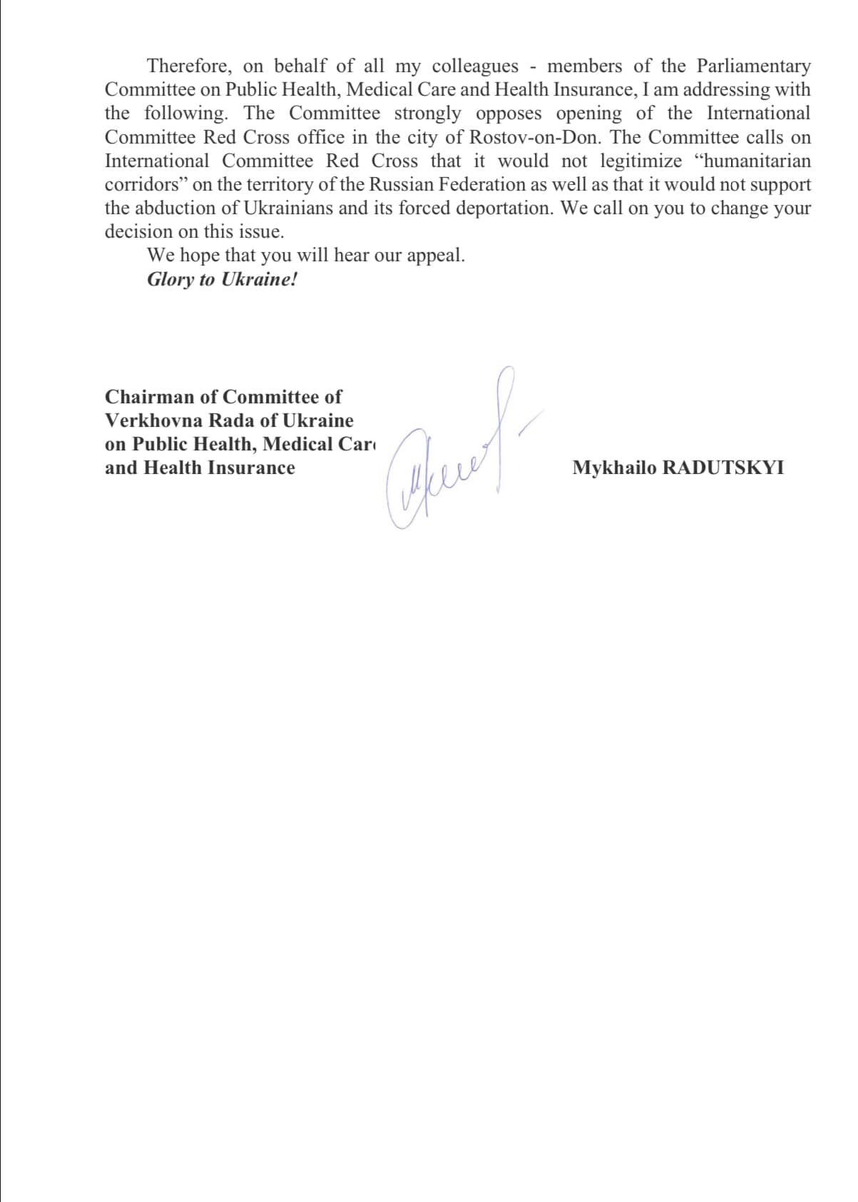 Радуцкий написал открытое письмо к Международному сообществу Красного Креста с таким призывом, чтобы не организовывать и не легитимизировать "гуманитарные корридоры" России, а также не поддерживать "похищение украинского населения оккупантами".