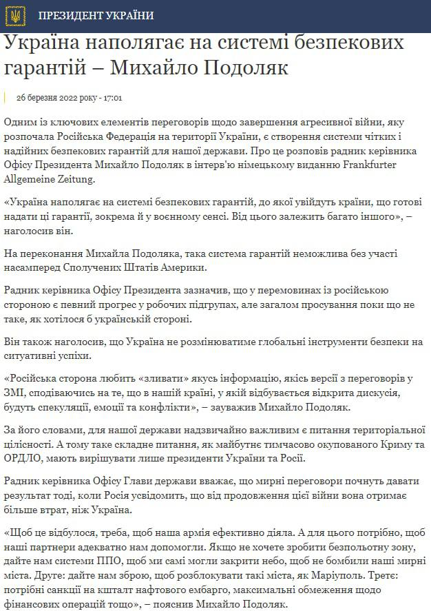 "Украина настаивает на системе гарантий безопасности, в которую войдут страны, готовые предоставить эти гарантии, в том числе и в военном смысле. От этого зависит многое другое. Российская сторона любит сливать в СМИ какую-то информацию, какие-то версии относительно переговоров, надеясь, что в нашей стране, в которой идет открытая дискуссия, будут спекуляции, эмоции и конфликты", - заявил Подоляк.