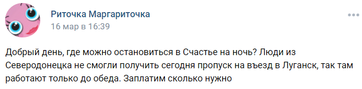 Жители Счастья пишут в соцсетях, что беженцы не успевают оформить пропуск, поскольку в райотделах эти документы выдают лишь до обеда. И поэтому по пути в Луганск люди вынуждены ночевать в Счастье.