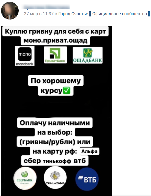 В Счастье Луганской области украинские банки не работают, но в местных пабликах уже появились предложения "обналичить" средства с карточных счетов - как в гривнах, так и в рублях.