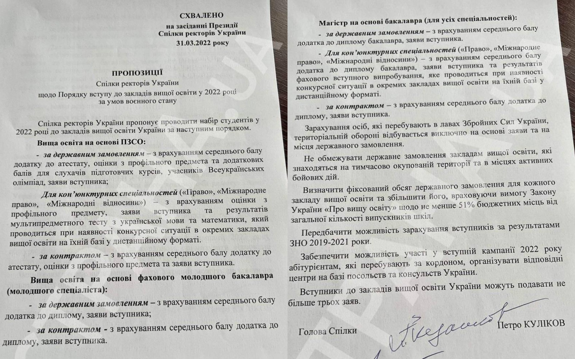 11.00 В распоряжении "Страны" оказались предложения союза ректоров Украины насчет Порядка вступления в ВУЗы в 2022 году в условиях военного положения. В документе предлагается зачислять лиц, которые служат в ВСУ и теробороне исключительно на основе заявления и на места госзаказа.
