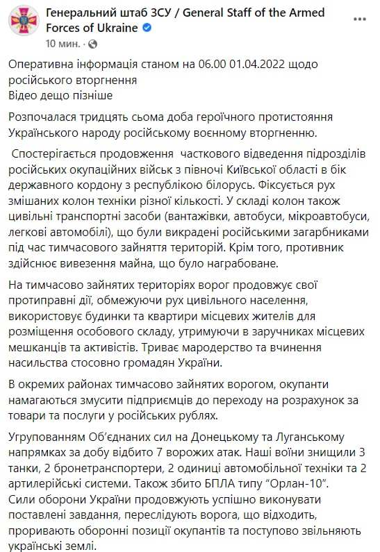 В ней говорится, что с севера Киевской области продолжается частичный вывод российских сил. Но ничего не говорится о том, что противник оставил Гостомель и Бучу (такие слухи уже начали курсировать в Сети).
