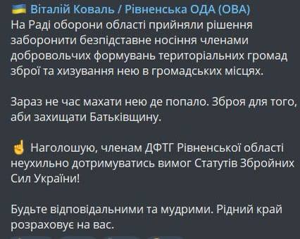 "Сейчас не время махать им где угодно. Оружие для того, чтобы защищать Родину", - написал Виталий Коваль и добавил, что члены добровольных форсирований Ровенской области должны неукоснительно соблюдать требования Уставов Вооруженных Сил Украины.
