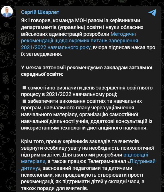 Кроме того, Шкарлет также обратился к учителям с напоминаем о важности психологической поддержки детей. Для этого Минобразования разработало специальные материалы и Telegram-канал "Поддержи ребенка".