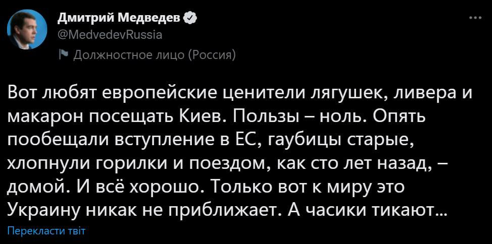 Зампред Совбеза РФ Дмитрий Медведев высказался по одобрению Германией поставок тяжелого вооружения в Киев.