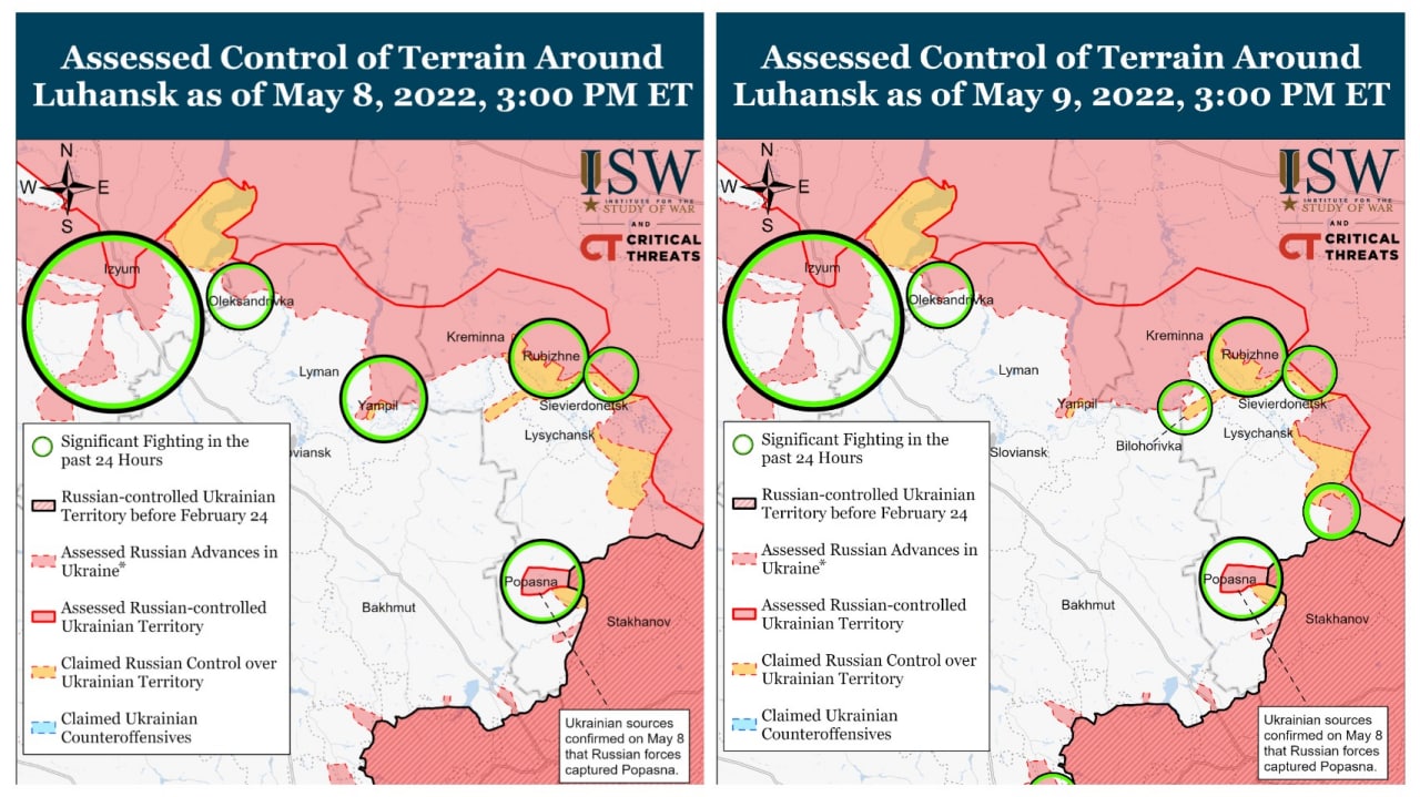 08:13 Сравнение военных карт за 8 и 9 мая по данным Института изучения войны (США).