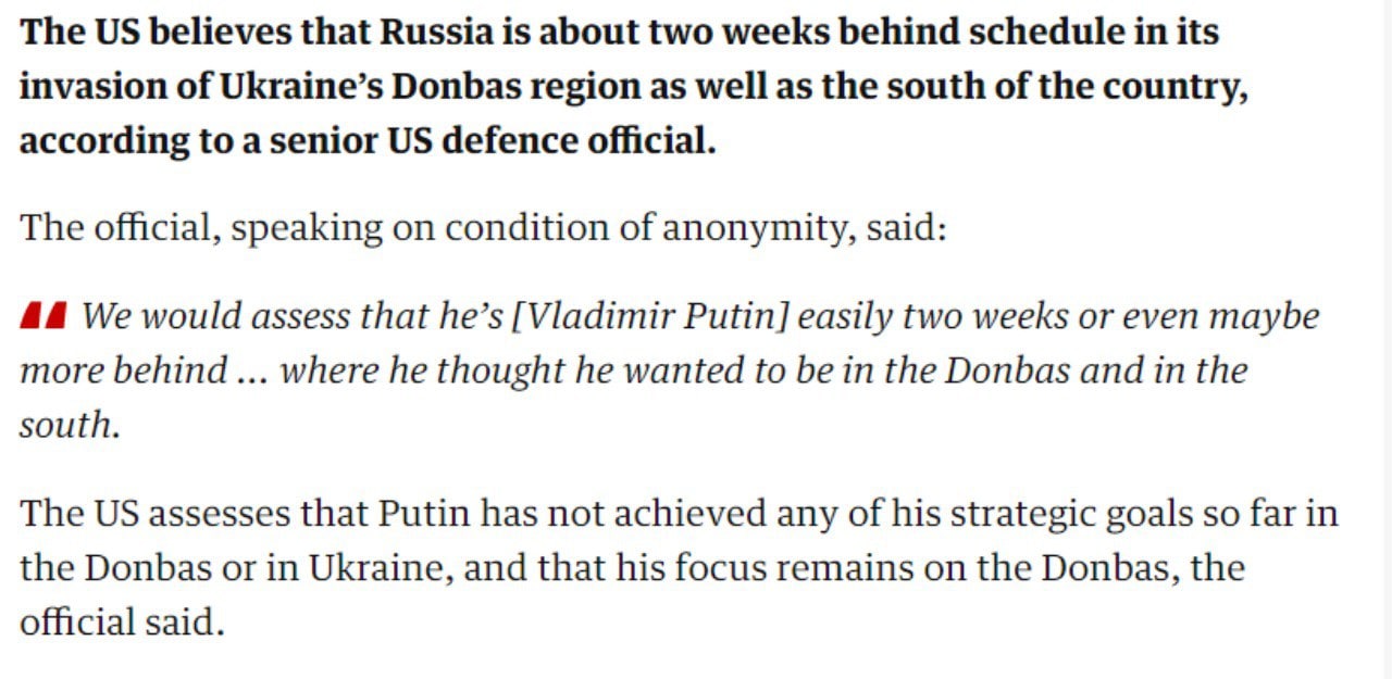 21.05 В своем наступлении на Донбасс и юг Украины Россия отстает от графика примерно "на две недели, а то и больше".
