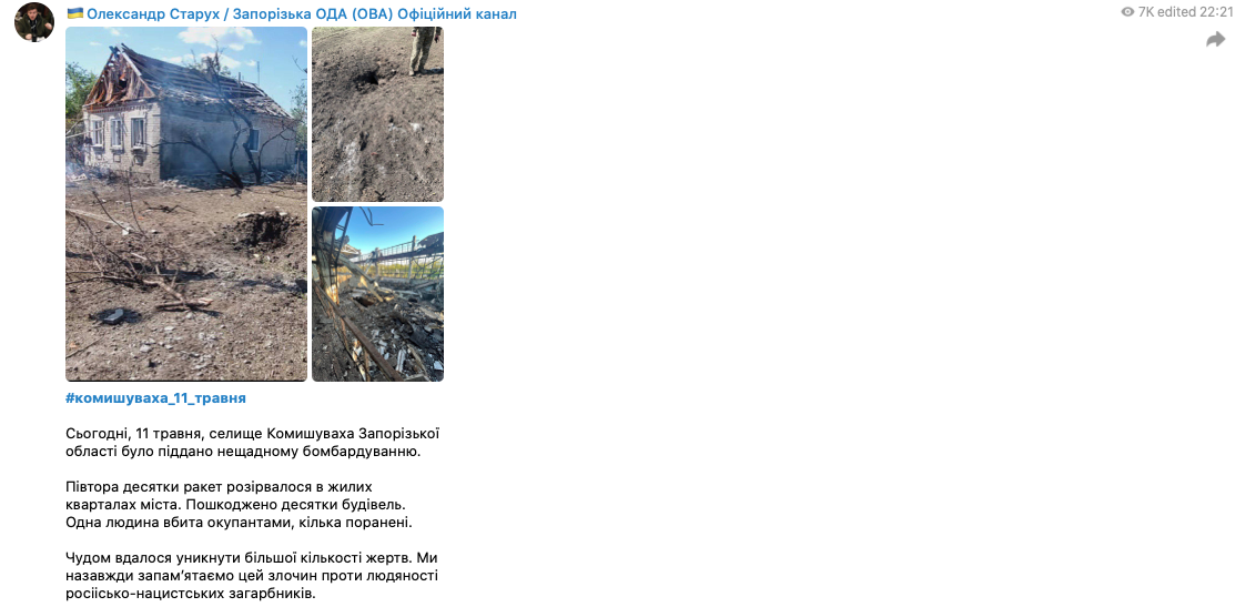 Об этом сообщил губернатор Запорожской области Александр Старух и опубликовал фото разрушений.