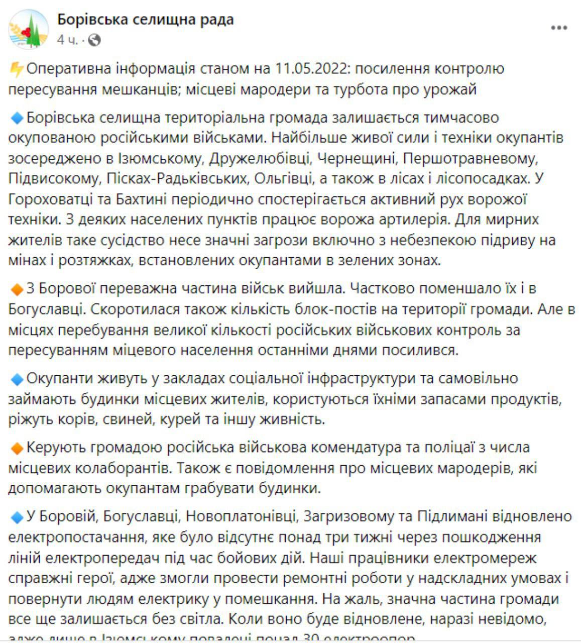 Большинство российских войск вышло из Боровой Харьковской области, однако они остаются в большом количестве в соседних населенных пунктах.
