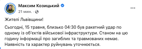 Глава Львовской ОВА Максим Козицкий написал, что во Львовской области ракетный удар был нанесен около 04:30 и пришелся по одному из объектов военной инфраструктуры.