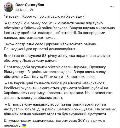 "В течение суток оккупанты обстреливали Циркуны, Прудянку, Ольховатку - трое гражданских пострадали. Вчера днем снова обстреляли Салтовку и Пятихатки - 3 пострадавших", - сообщил Синегубов.