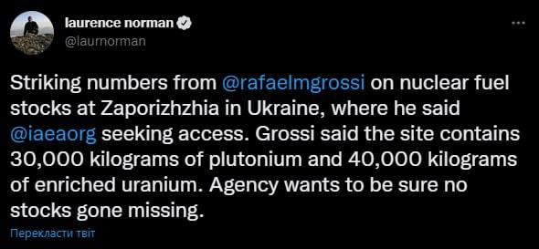 По данным гендиректора МАГАТЭ Рафаэля Гросси, на захваченной Россией Запорожской АЭС хранятся 30 тонн плутония и 40 тонн обогащенного урана.