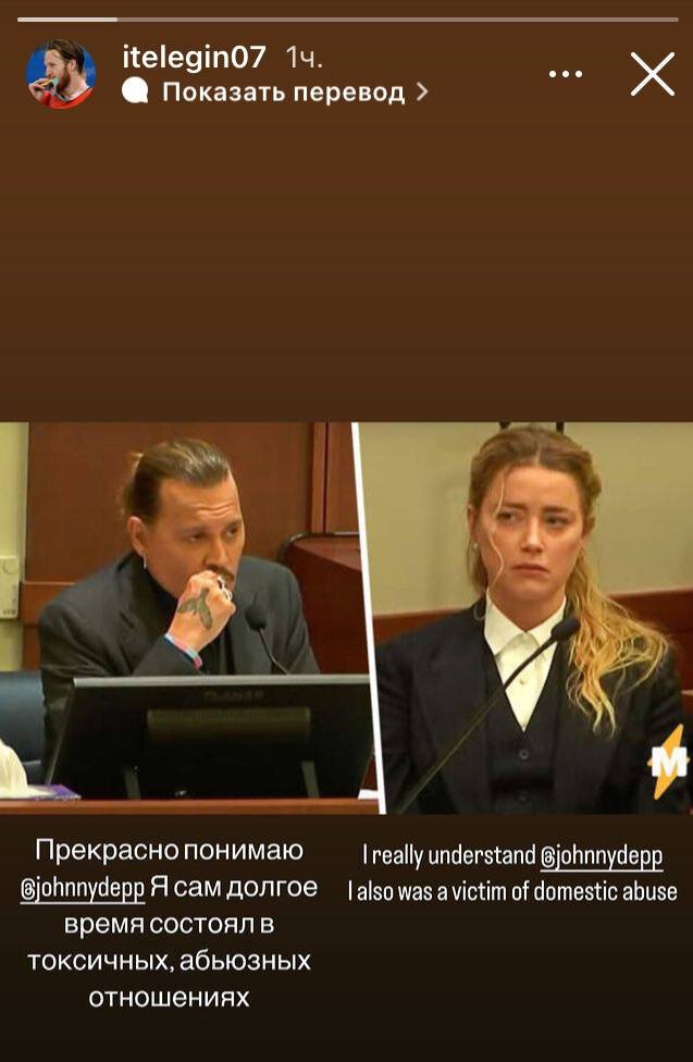 "Прекрасно понимаю Джонни Деппа. Я сам состоял в токсичных, абьюзных отношениях, был жертвой", - написал Телегин в сторис своего Instagram.