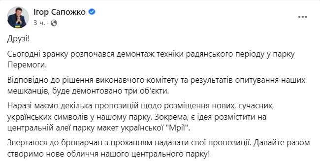 В парке Победы демонтируют советские объекты. Фото: facebook.com/i.sapozhko