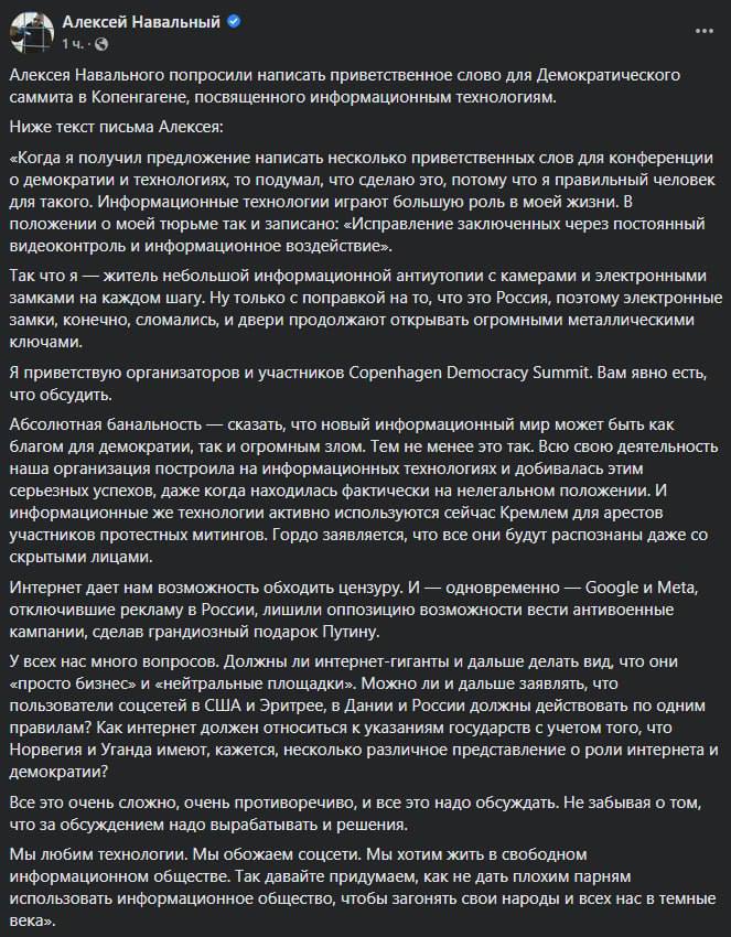 Этим интернет-гиганты сделали "грандиозный подарок Путину", пишет находящийся в тюрьме оппозиционер в своем обращении к Демократическому саммиту в Копенгагене.