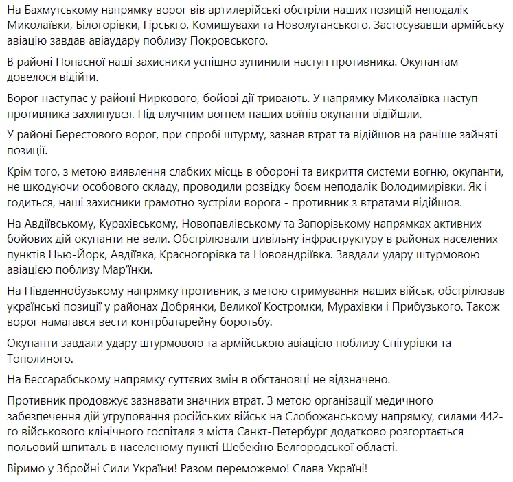 В районе Берестового (северо-западнее Нырково) россияне при попытке штурма понесли потери и отошли на ранее занятые позиции.