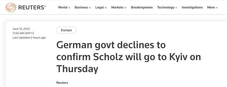 В Германии не подтверждают информацию, что канцлер Олаф Шольц вместе с президентом Франции Эммануэлем Макроном и премьер-министром Италии Марио Драги посетит Киев в четверг.