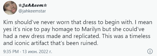 "Ким вообще не следовало надевать это платье. Я имею в виду, что да, приятно воздать должное Мэрилин, но она могла бы сделать новое платье и скопировать его. Это был вневременной и культовый артефакт, который был поврежден", "Оставьте Ким уничтожить историческое произведение искусства", "Поздравляем Met Gala с демонстрацией реального примера того, почему отдел консервации, такой как Институт костюма, необходим для исторически значимых предметов одежды", – пишут в комментариях.
