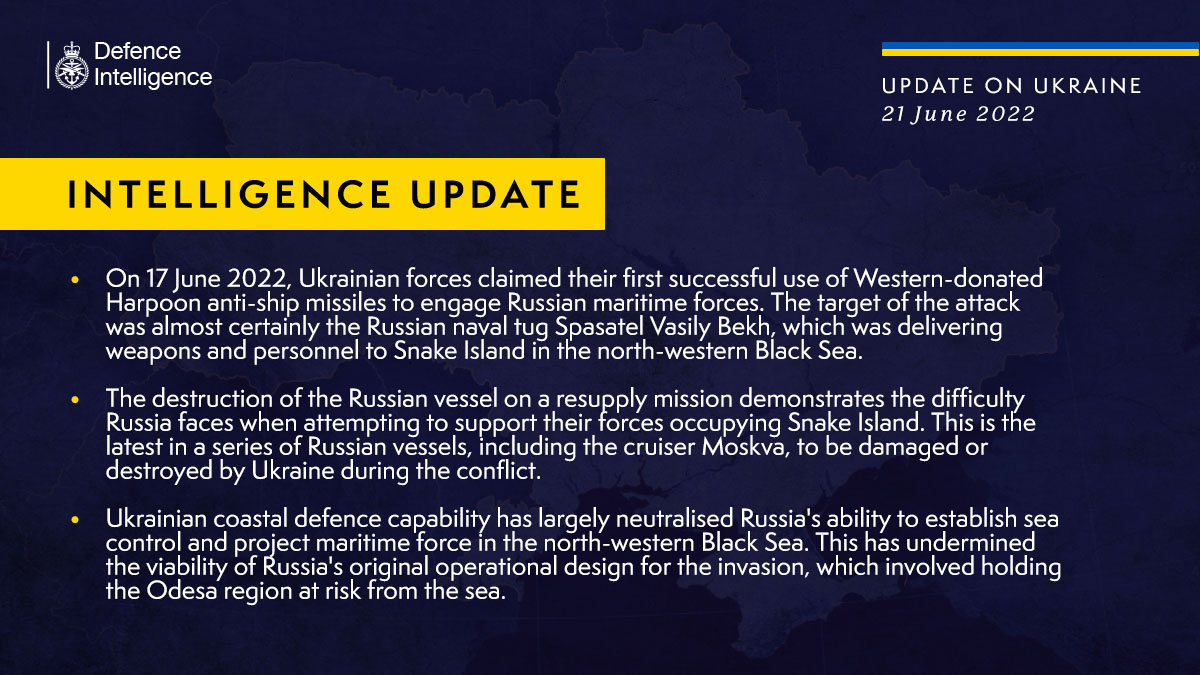 - 17 июня украинские силы заявили о своем первом успешном применении противокорабельных ракет Harpoon, полученных от Запада.